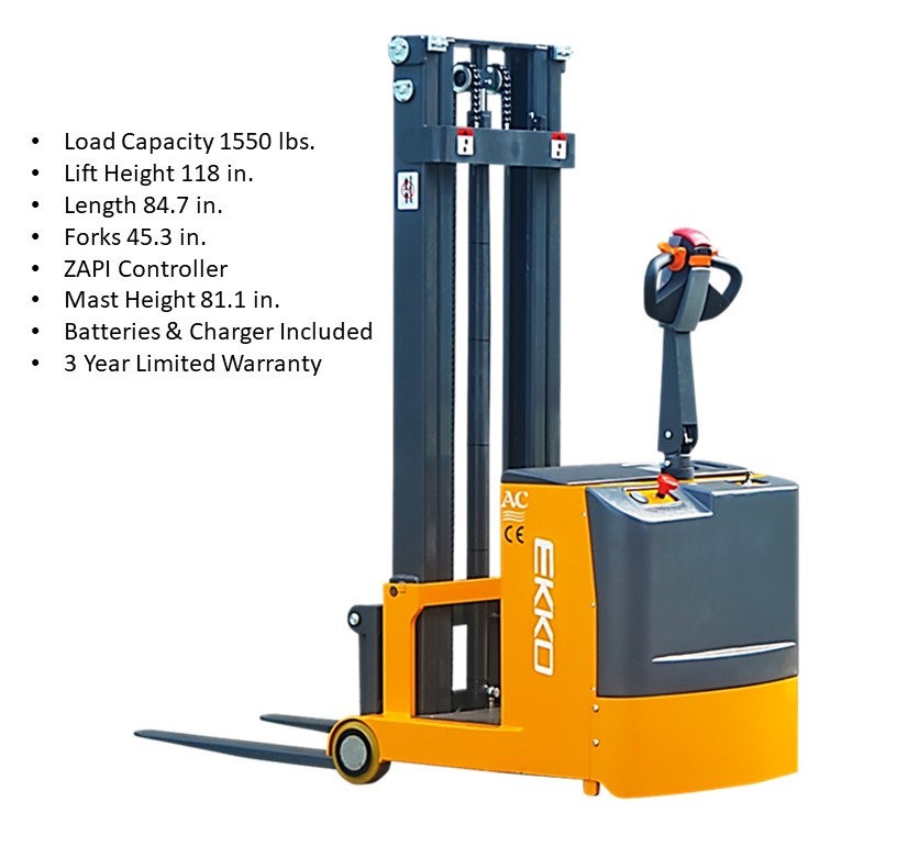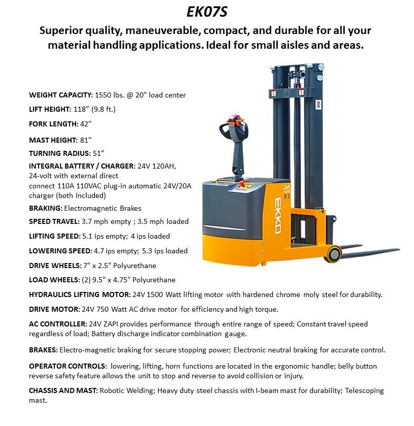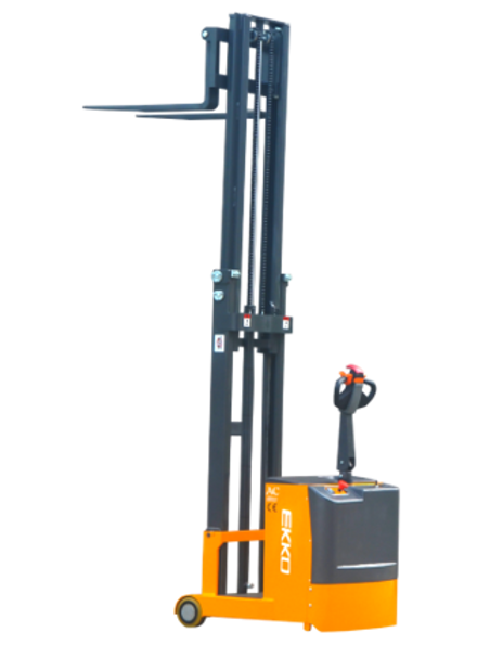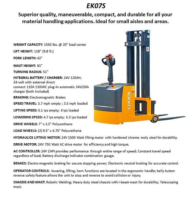 The EKKO EK07S Fully Powered Counterbalance Walkie Stacker is designed with the combination of the versatility of forklift and a walkie stacker. It is ideal for loading and unloading trucks, loading docks, stock rooms, manufacturing floors and warehousing.
