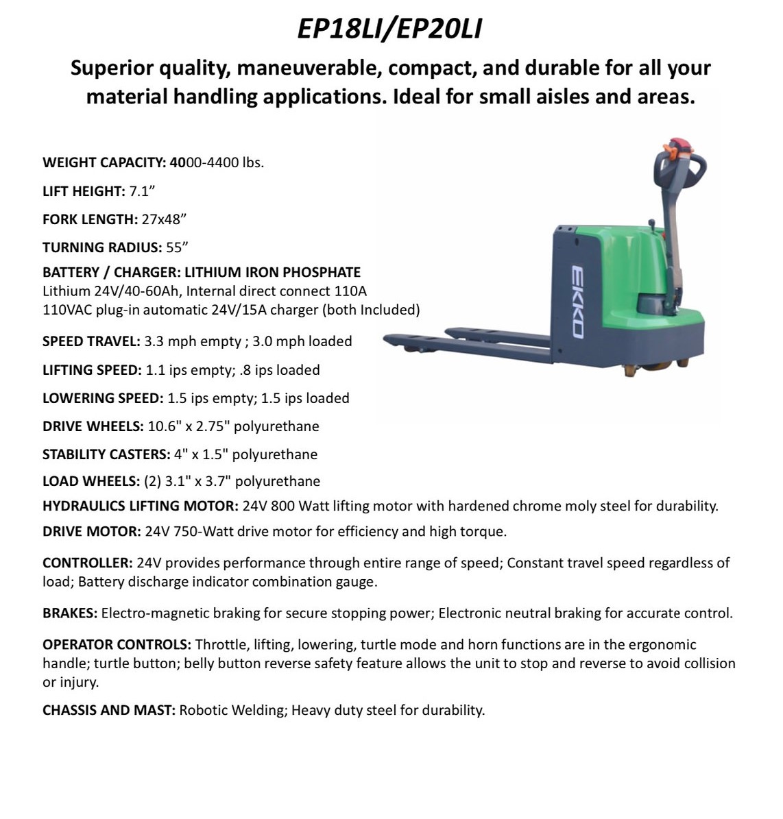 The EKKO EP20LI Lithium Iron Phosphate Electric Walkie Pallet Jack is designed with the versatility of a pallet jack with full power lifting and driving capabilities. It is ideal for loading and unloading trucks, loading docks, stock rooms, manufacturing floors and warehousing.