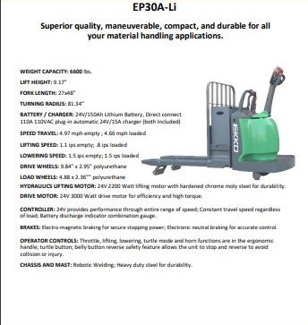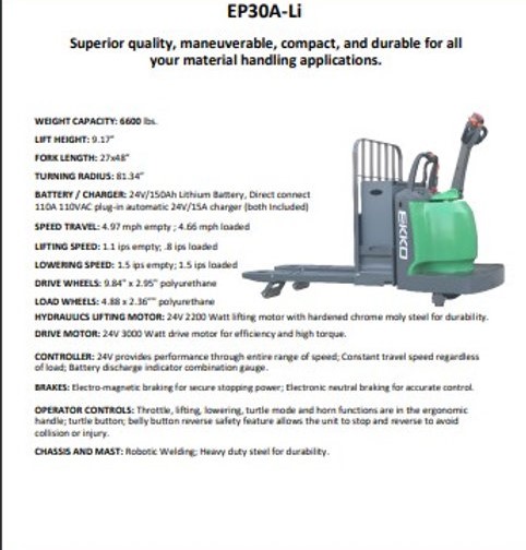 The EKKO EP30A-Li Lithium Rider Pallet Jack is designed with the versatility of a pallet jack with full power lifting and driving capabilities. It is ideal for loading and unloading trucks, loading docks, stock rooms, manufacturing floors and warehousing.