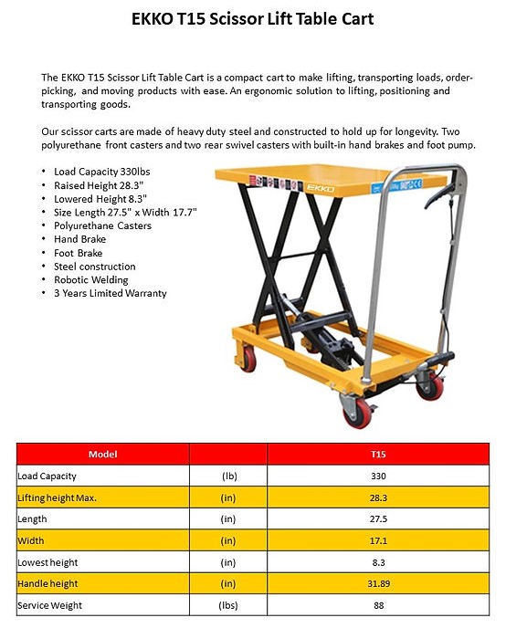 The EKKO T15 Scissor Lift Table Cart is a compact cart to make lifting, transporting loads, order-picking, and moving products with ease. An ergonomic solution to lifting, positioning and transporting goods.