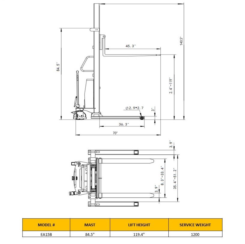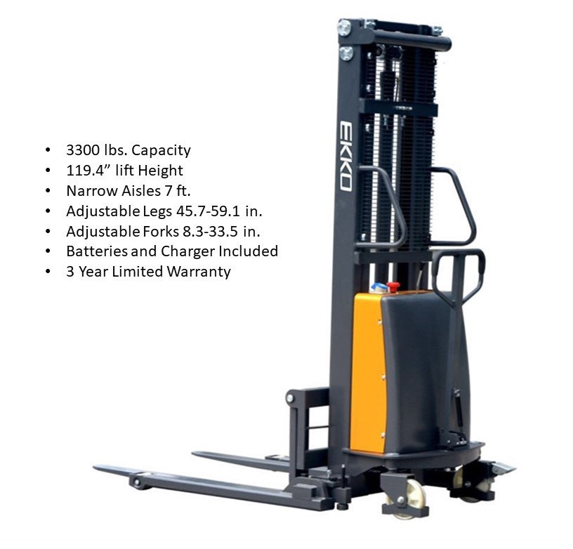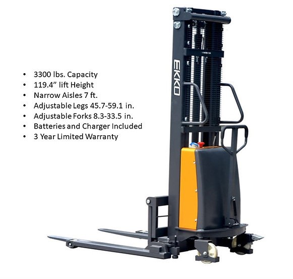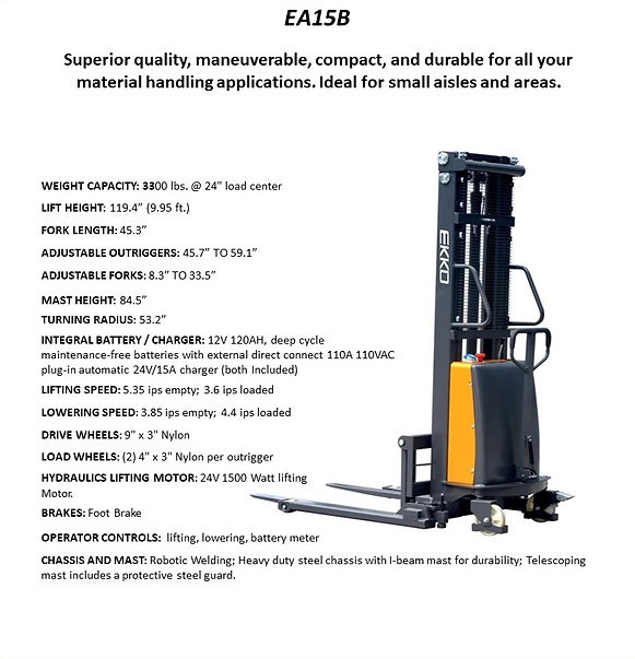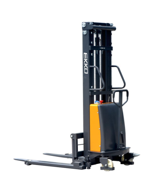 The EKKO EA15B Semi-Electric Straddle Stacker is designed with the combination of the versatility of forklift and a pallet stacker. It is ideal for loading and unloading trucks, loading docks, stock rooms, manufacturing floors and warehousing.