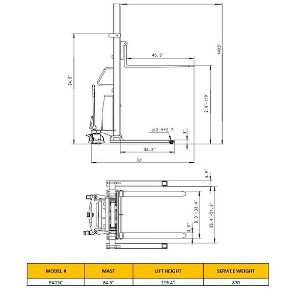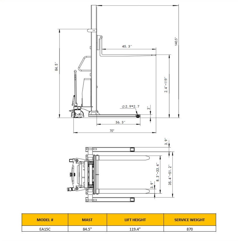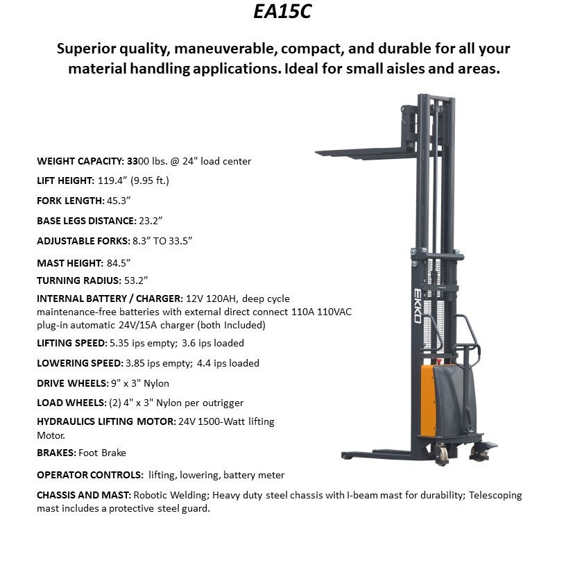 The EKKO EA15C Semi-Electric Fork-Over Stacker is designed with the combination of the versatility of forklift and a pallet stacker. It is ideal for loading and unloading trucks, loading docks, stock rooms, manufacturing floors and warehousing.
