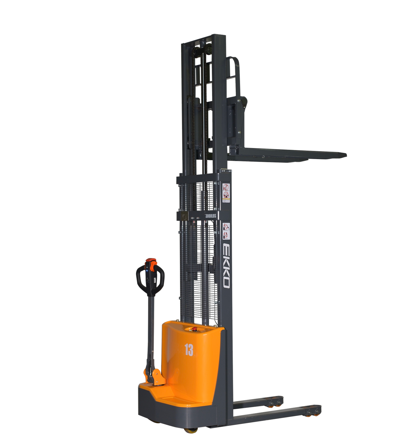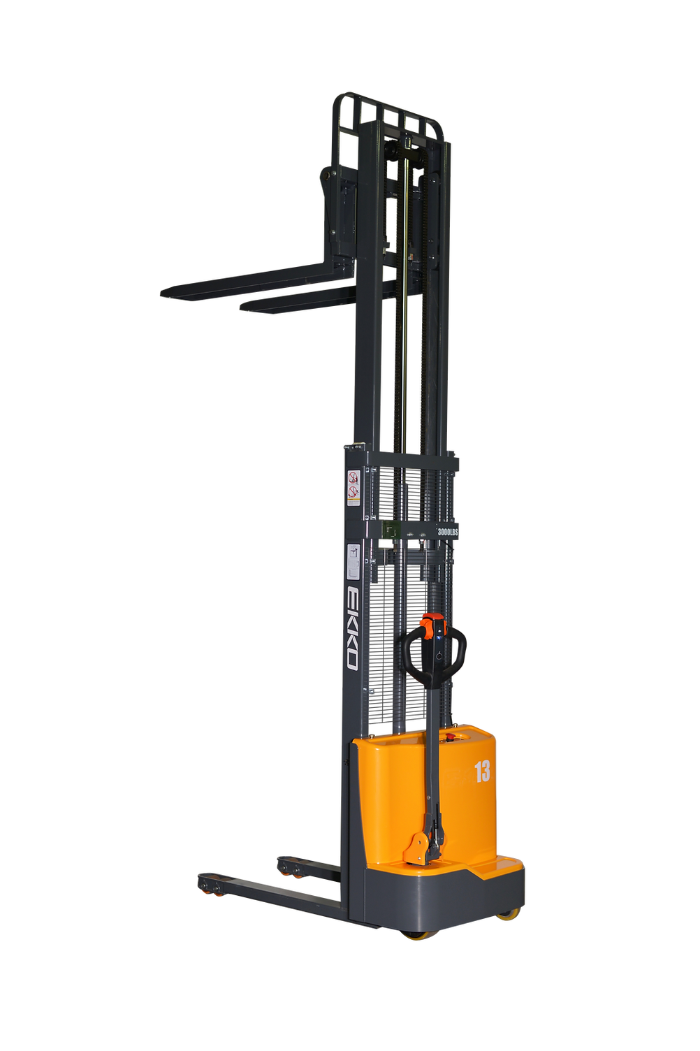 The EKKO EB13CD Electric Fork Over Stacker is designed with the combination of the versatility of a forklift, reach truck and a walkie stacker. It is ideal for loading and unloading trucks, loading docks, stock rooms, manufacturing floors and warehousing.