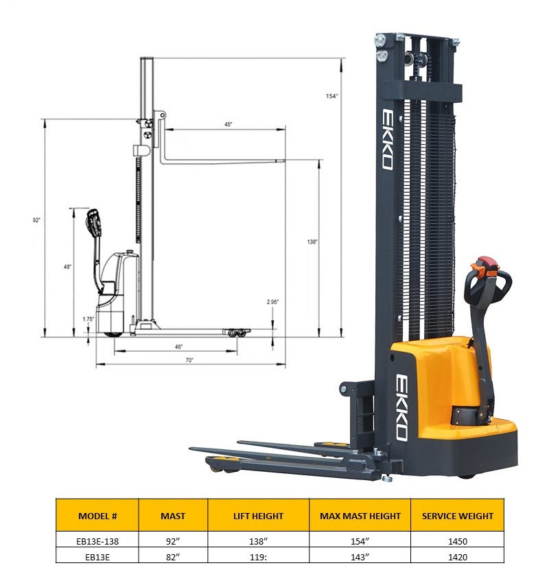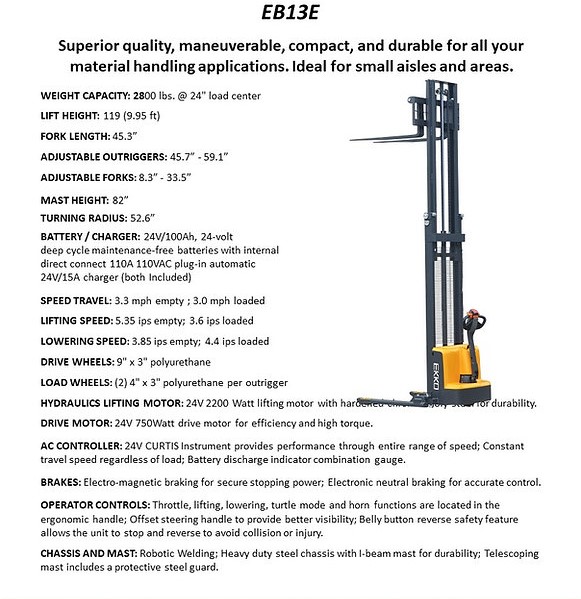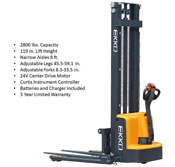 The EKKO EB13E Electric Straddle Stacker is designed with the combination of the versatility of a forklift, reach truck and a walkie stacker. It is ideal for loading and unloading trucks, loading docks, stock rooms, manufacturing floors and warehousing.