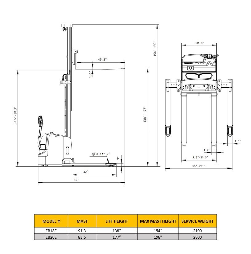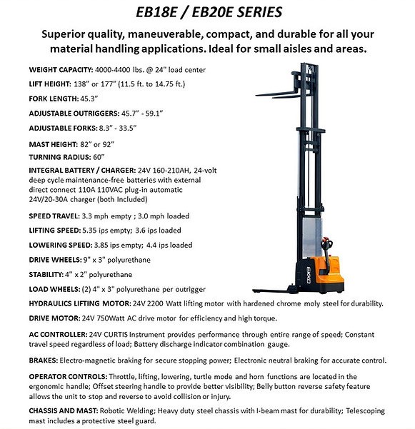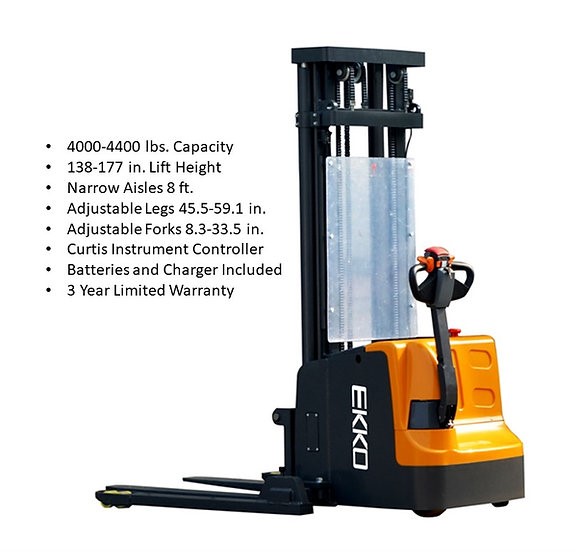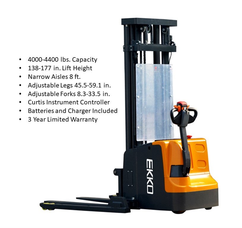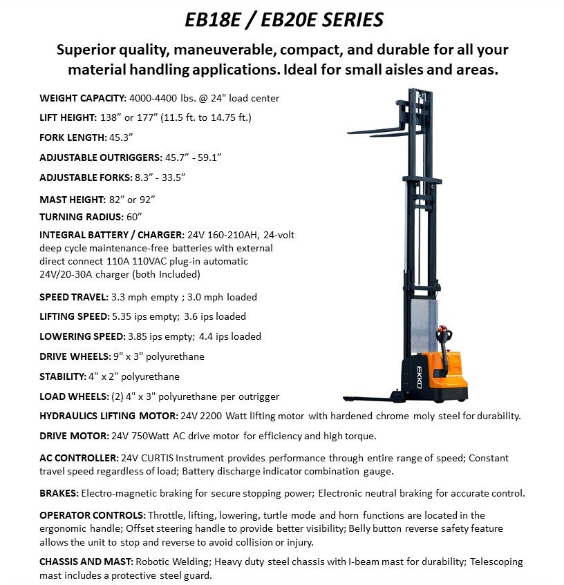 The EKKO EB18E Electric Straddle Stacker is designed with the combination of the versatility of a forklift, reach truck and a walkie stacker. It is ideal for loading and unloading trucks, loading docks, stock rooms, manufacturing floors and warehousing.