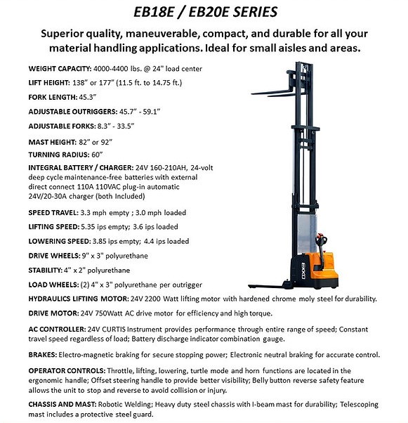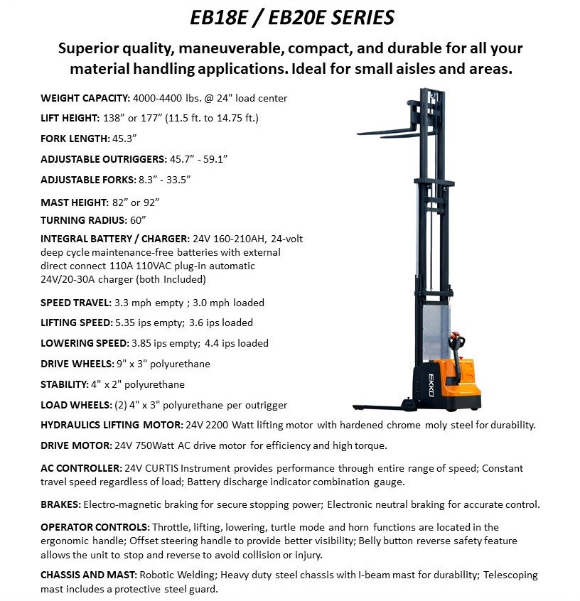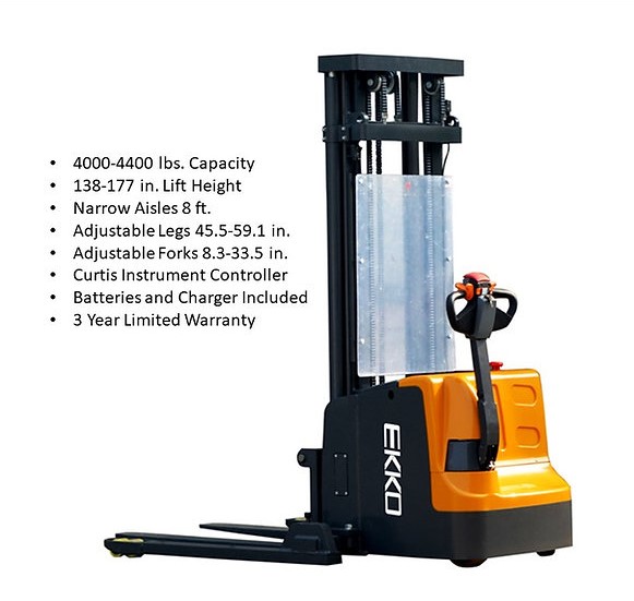 The EKKO EB20E Electric Straddle Stacker is designed with the combination of the versatility of a forklift, reach truck and a walkie stacker. It is ideal for loading and unloading trucks, loading docks, stock rooms, manufacturing floors and warehousing.