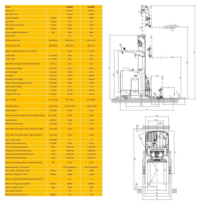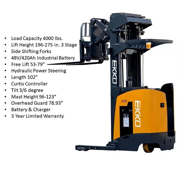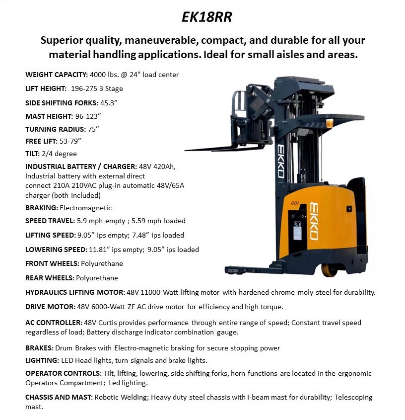 The EKKO EK18RR Stand-up Narrow Aisle Reach Truck is designed with the combination of the versatility of a forklift, reach truck and a walkie stacker. It is ideal for loading and unloading trucks, loading docks, stock rooms, manufacturing floors and warehousing.
