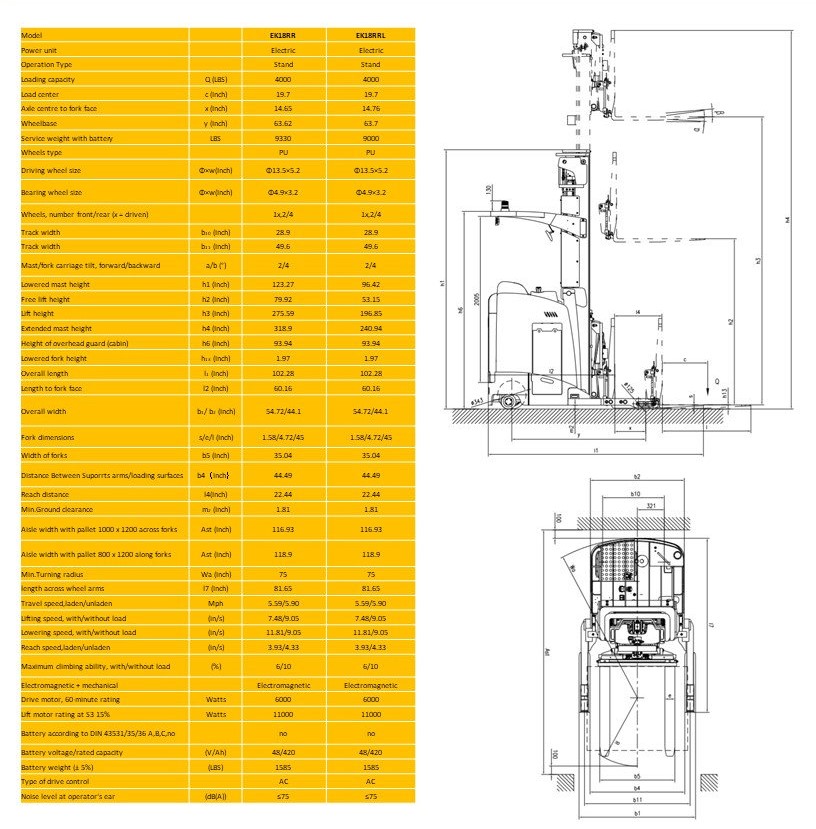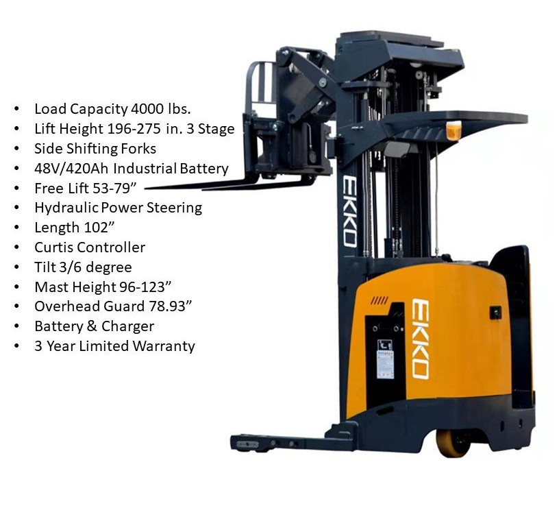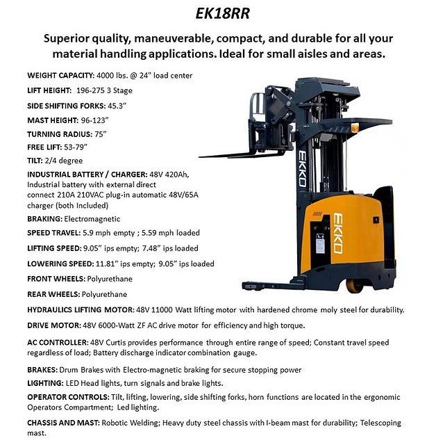 The EKKO EK18RRL Stand-up Narrow Aisle Reach Truck is designed with the combination of the versatility of a forklift, reach truck and a walkie stacker. It is ideal for loading and unloading trucks, loading docks, stock rooms, manufacturing floors and warehousing.