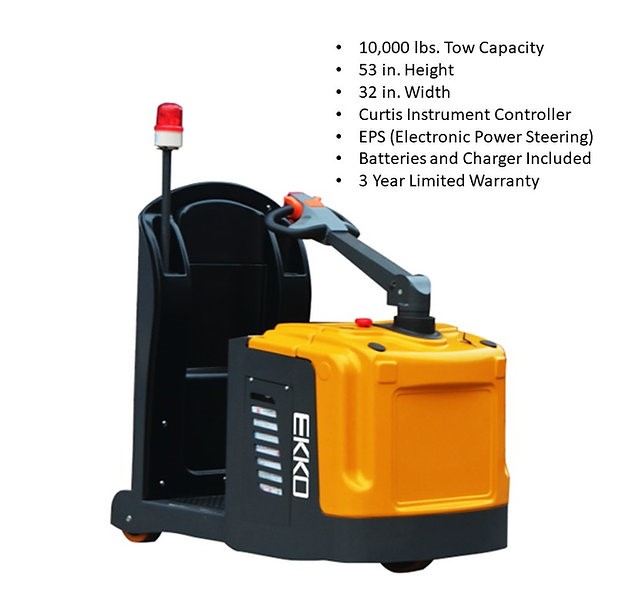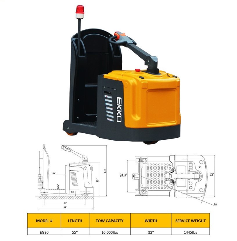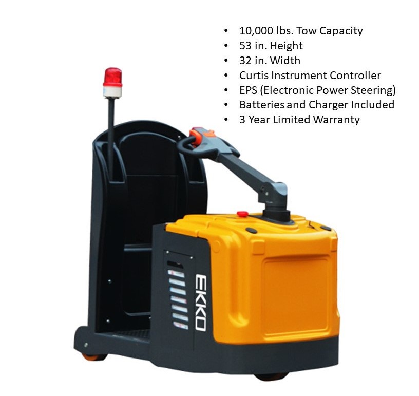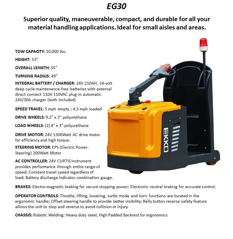 The EKKO EG30 Tow Tractor is designed for tugging and pulling applications made with quality materials, components and workmanship. Every product is robotically welded, powder coated and is reliable for loading and unloading trucks, loading docks, stock rooms, manufacturing floors and warehousing.
